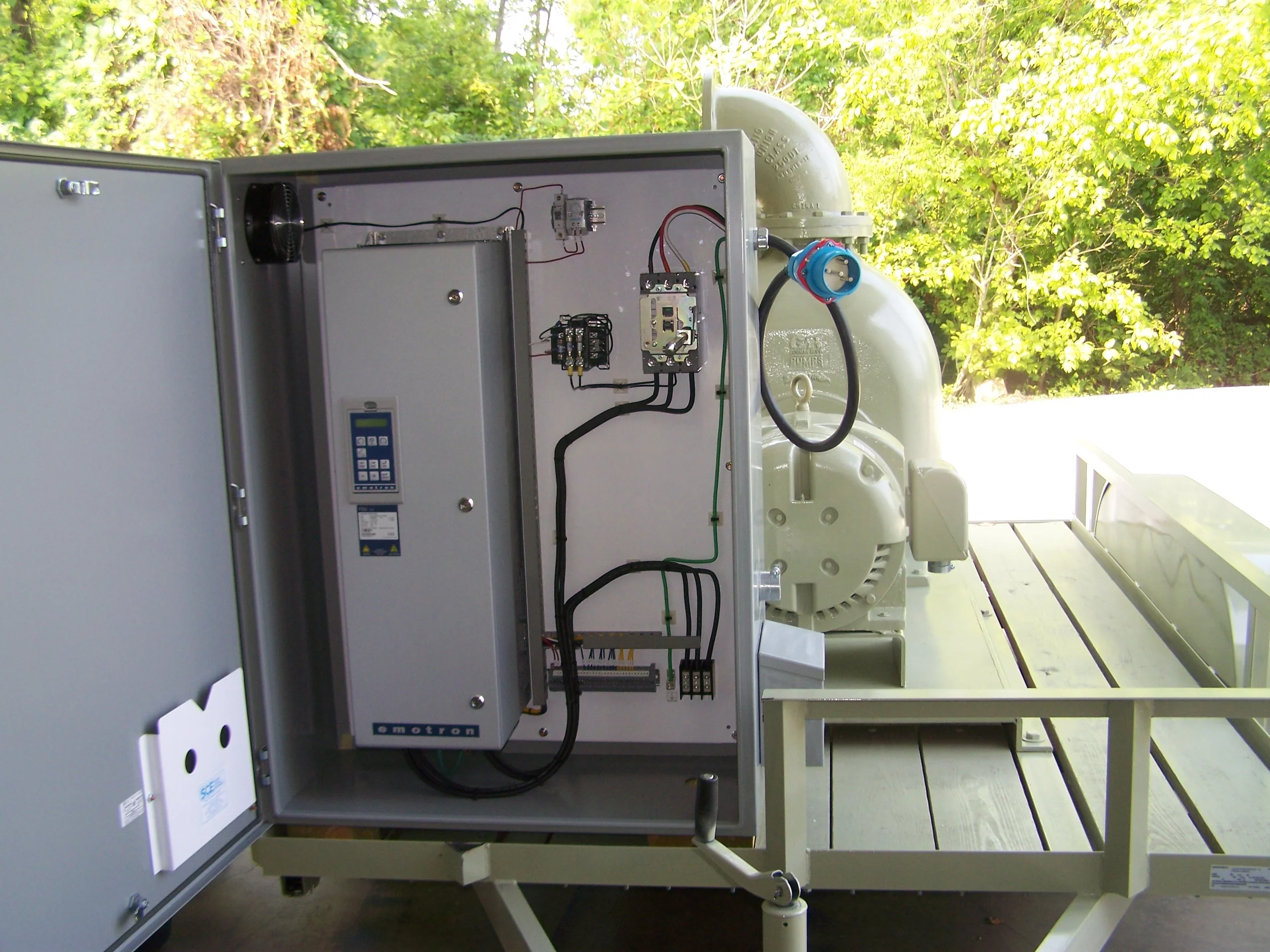 At the beginning of 2007, Tennessee Process Pumps proposed a solution to their customer. The solution consisted of a 50HP 10″ self-priming pump, and an Emotron FDU 2.0 Variable Frequency Drive. Emotron built their VFD into a ventilated NEMA 4 enclosure that also included inline circuit breakers, rain hoods, a thermostat, and a cooling system. The entire package was then permanently mounted onto a 10′ x 6′ double axle trailer rated for 3,500lbs., and installed at the club’s facility in October 2007.